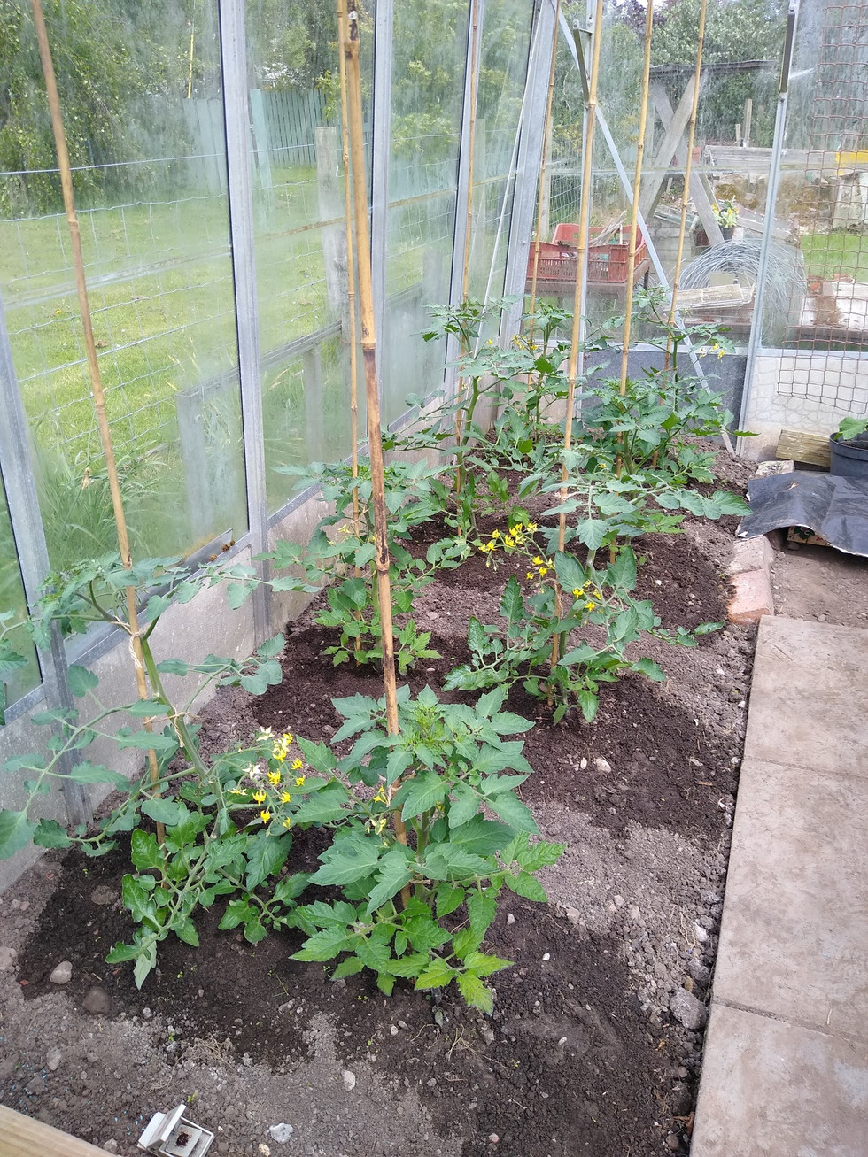 Cold days and colder night have slowed down the hardening off process. With the benefit of overnight heating when required tomato plants are motoring on, however. Sungold on 2nd truss and Shirley on 1st.