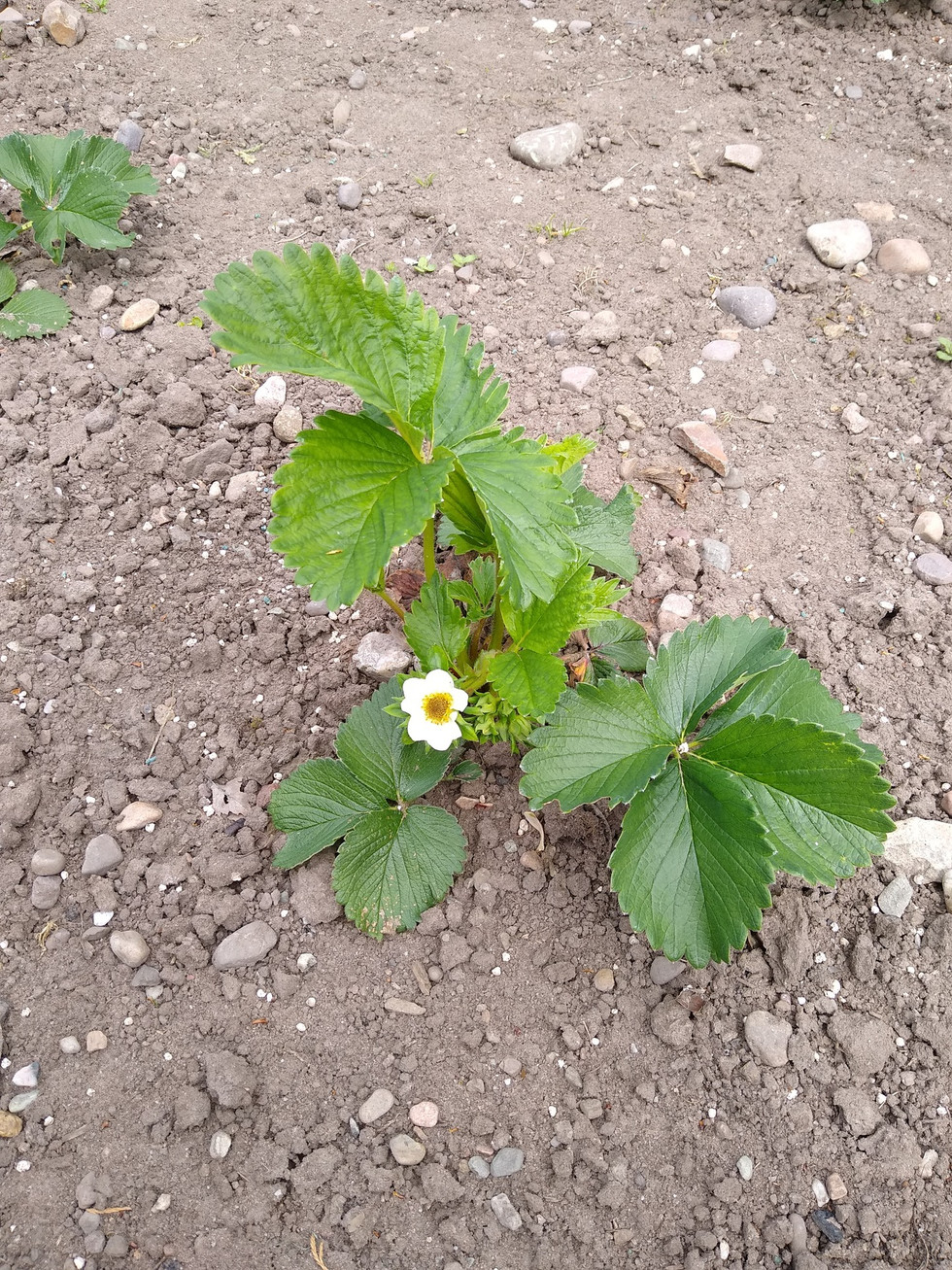 The centre of that early strawberry flower has been frosted; when it turns black you know it is not going to swell and form a fruit. The fruit agronomists used to tell us that the plants compensate by producing more flowers. I will go over them and snip off the flowers with the dead centres, hoping to stimulate them into producing more. That plant is a Sonata; the Florence are a bit later and the flowers aren't out yet. Keeping the dutch hoe going in these dry conditions because when the straw goes down shortly, weed control is very difficult.